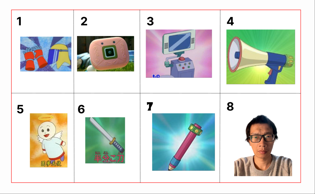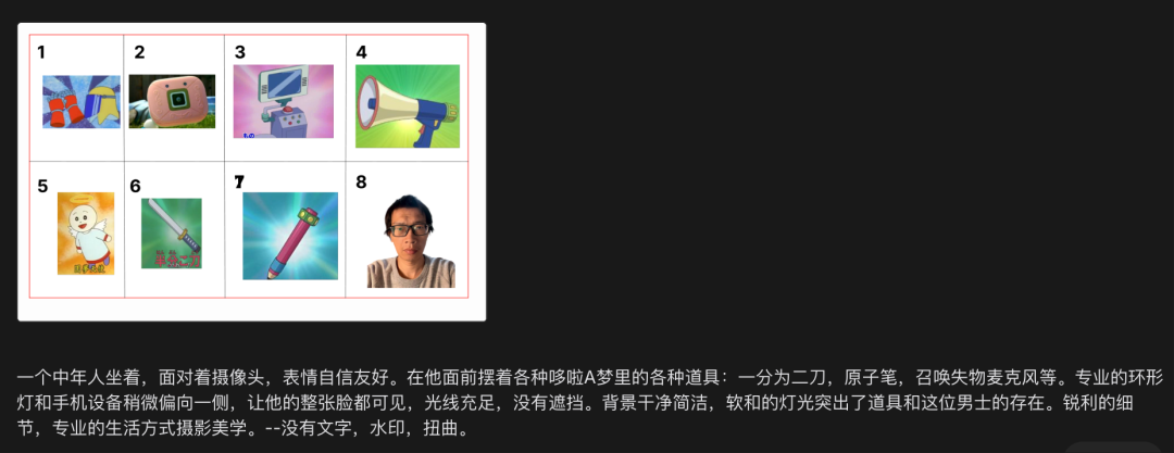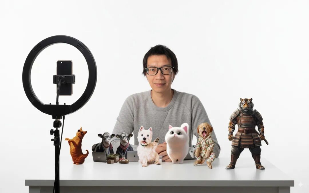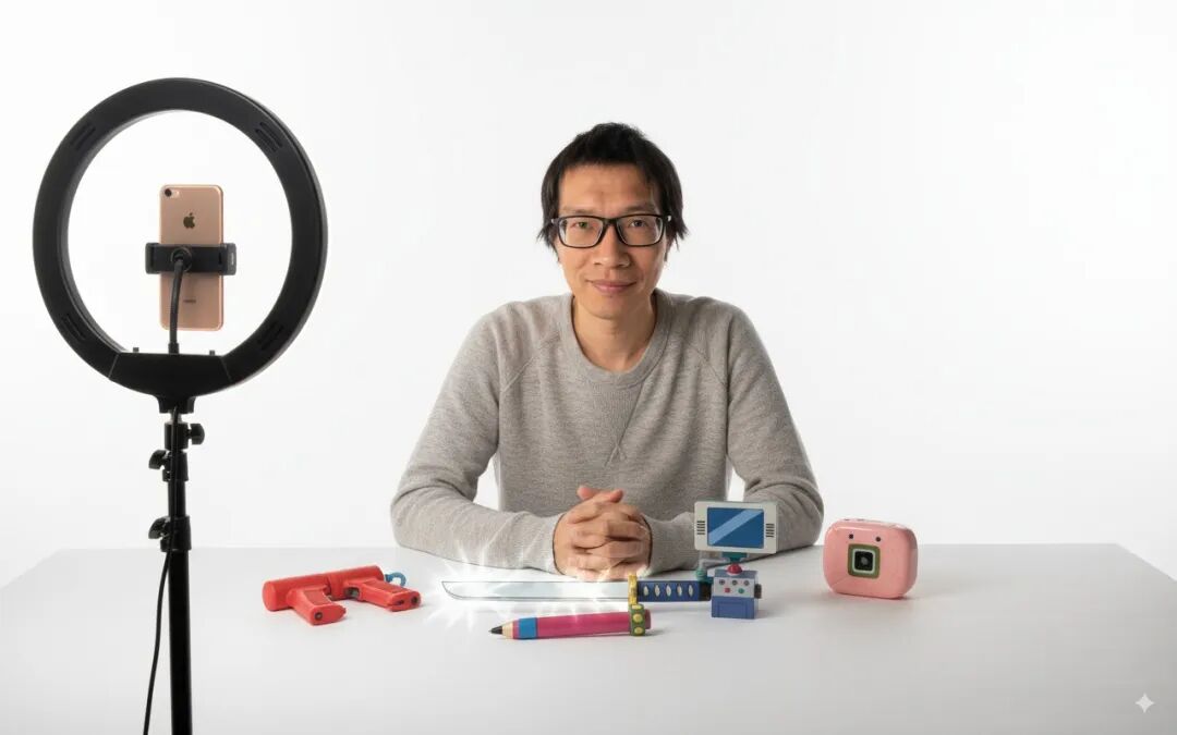 一个中年人坐着,面对着摄像头,表情自信友好。在他面前摆着各种哆啦A梦里的各种道具:一分为二刀,原子笔,召唤失物麦克风等。专业的环形灯和手机设备稍微偏向一侧,让他的整张脸都可见,光线充足,没有遮挡。背景干净简洁,软和的灯光突出了道具和这位男士的存在。锐利的细节,专业的生活方式摄影美学。–没有文字,水印,扭曲。