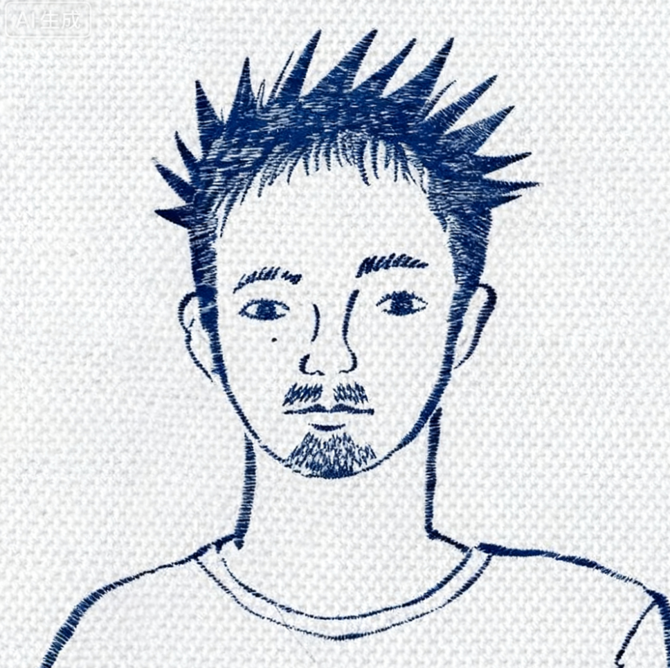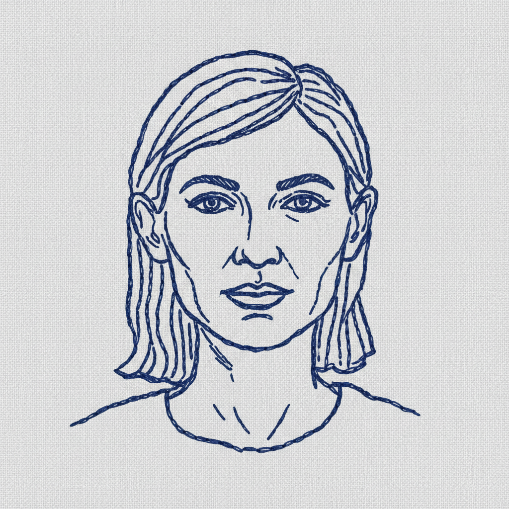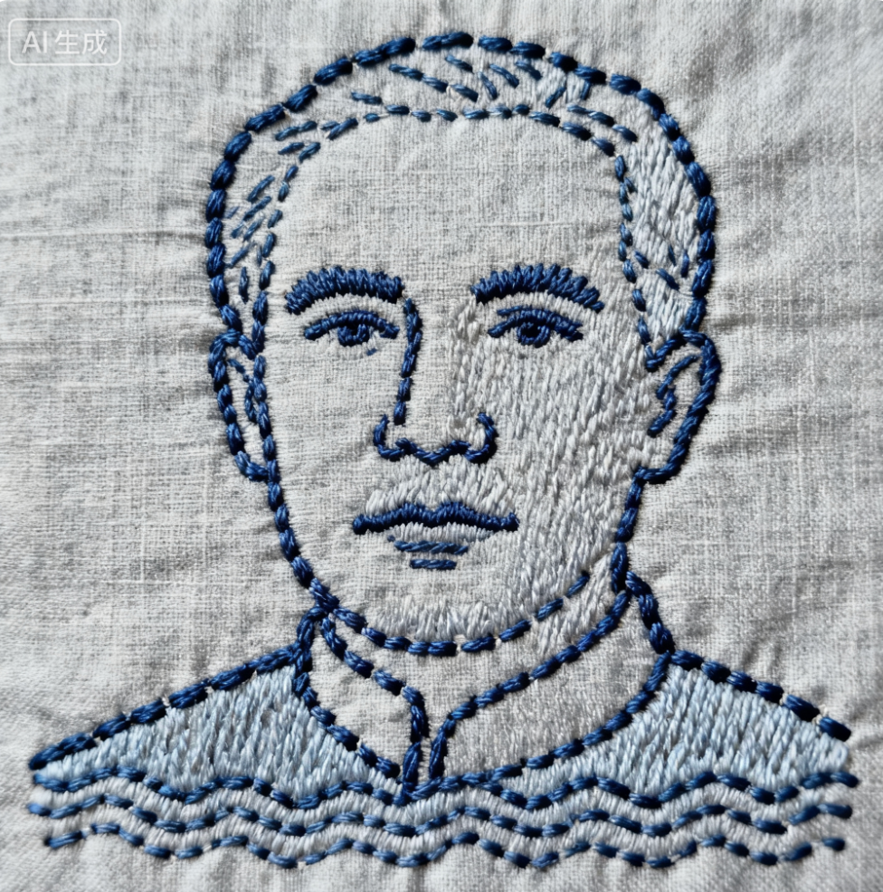 复古蓝色线绣风格,配以浅灰色面料纹理背景。使用更稀疏的深蓝色针脚勾勒人物的轮廓和细节(形象略带夸张风格),模拟手工刺绣的粗糙纹理和波浪线条。针脚分布极度简洁克制,减少非必要装饰元素,突出主体轮廓,营造简约风格的传统织物刺绣肖像效果,带有充满手工温暖的复古风格。