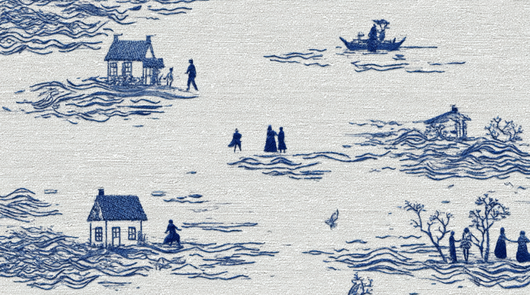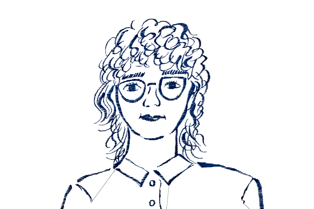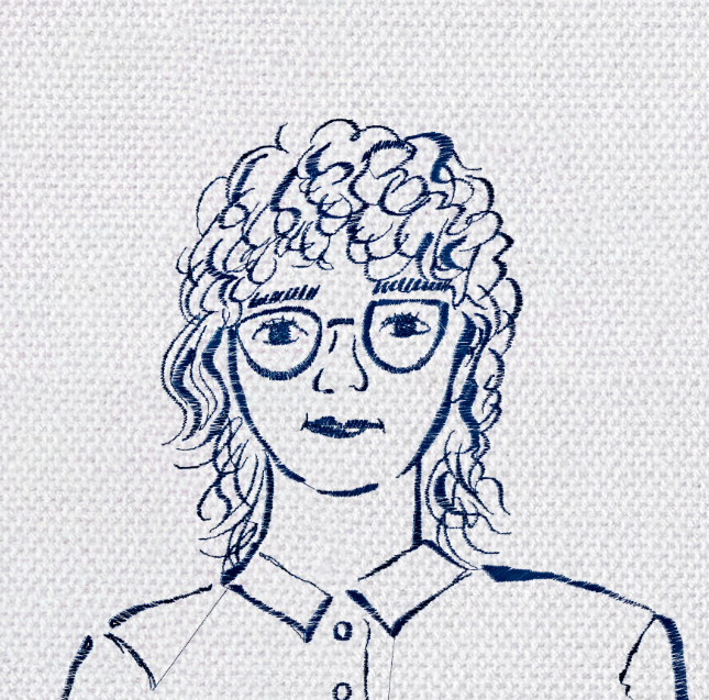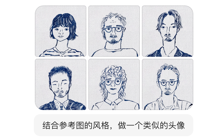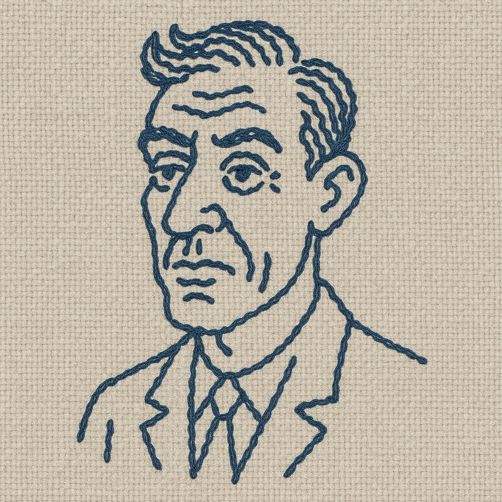 复古蓝色线绣风格,配以浅灰色面料纹理背景。使用更稀疏的深蓝色针脚勾勒人物的轮廓和细节(形象略带夸张风格),模拟手工刺绣的粗糙纹理和波浪线条。针脚分布极度简洁克制,减少非必要装饰元素,突出主体轮廓,营造简约风格的传统织物刺绣肖像效果,带有充满手工温暖的复古风格。