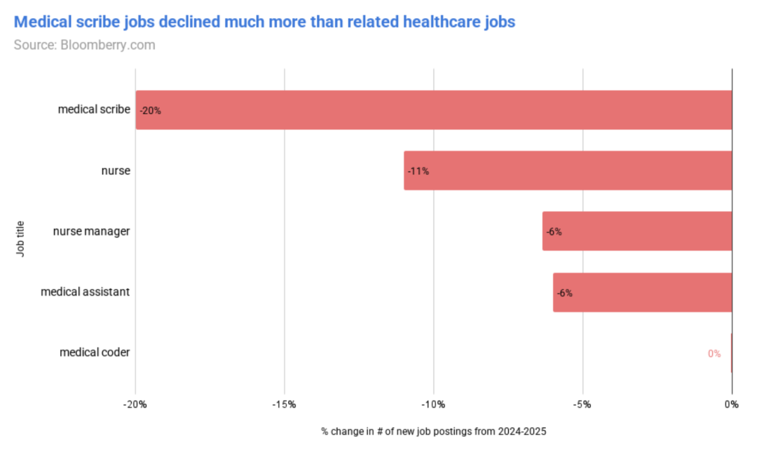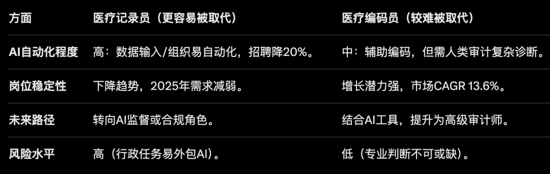 这个我觉得特别能说明问题。医疗记录员是干嘛的?就是医生看病的时候,你在旁边记录”患者说了啥、医生说了啥、诊断是啥”。这活儿现在AI完全能干了!你想啊,语音识别 + 大语言模型,直接生成病历,又快又准。而医疗编码员就更专业一些了,简单来说,他们是“医疗记录的翻译者”,确保医疗数据准确、可追溯,避免因编码错误导致的经济损失或统计偏差。(但作者的意思是,可能结论下的为时太早,还需要观察一两年的数据才靠谱。)