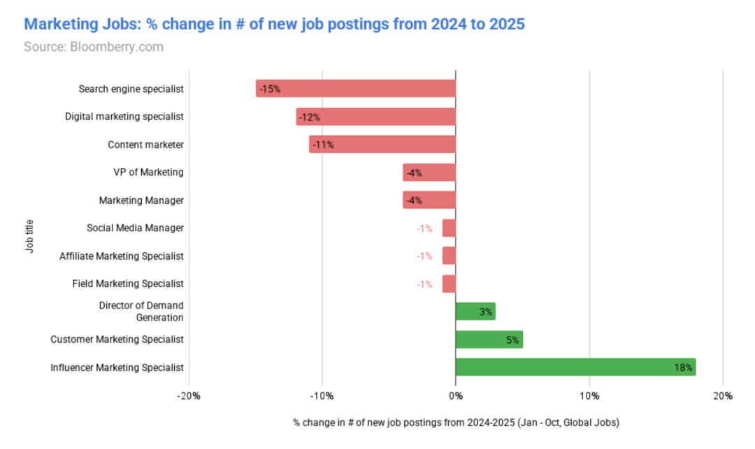 传统营销岗位一片惨淡,但网红营销专员涨了18%!而且这是连续两年涨(2024年涨10%,2025年又涨18%)。