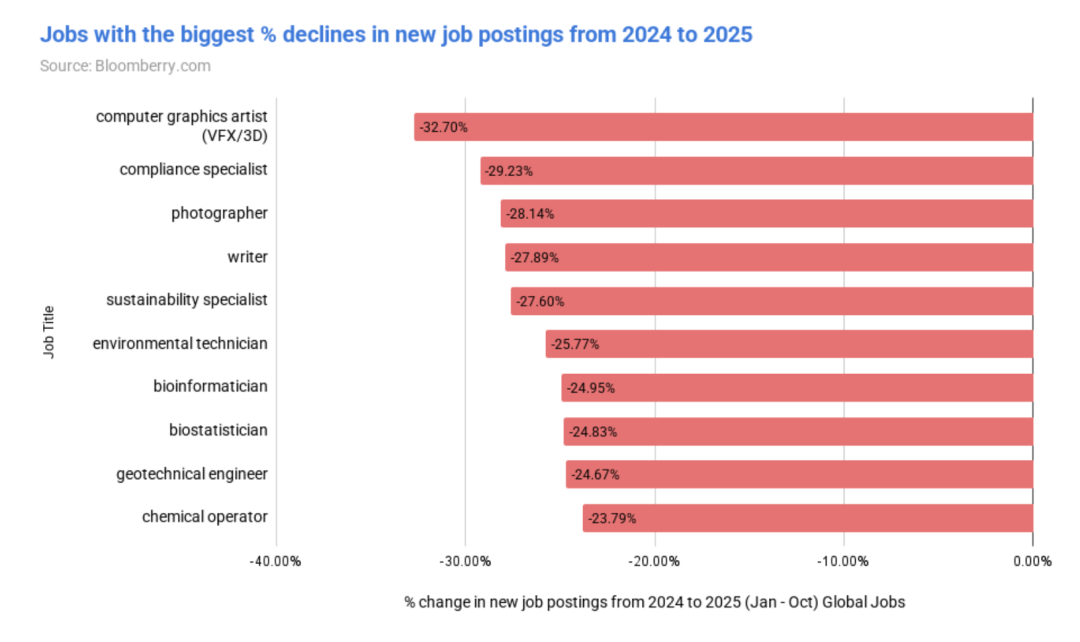 如果你在那些下跌的职位里,别恐慌,但也别装看不见。要么往上爬(做决策而不是执行),要么学新技能(特别是AI相关的),要么转向那些AI干不了的事(需要同情心和复杂判断的)。